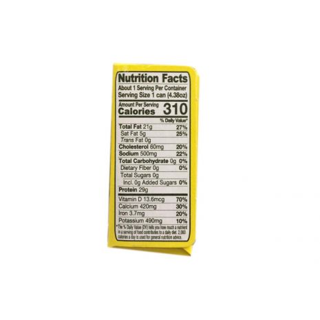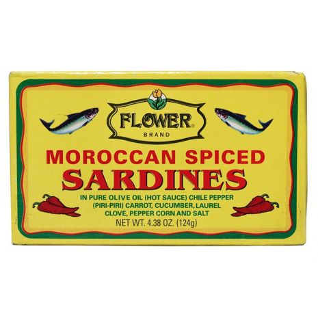 Flower Brand Moroccan Spiced Sardines in 4.38 oz (124 g) can. In pure olive oil (hot sauce) chile pepper (Piri-piri), carrot, gherkin, Laurel Clove, Pepper Corn and Salt. 4 pieces of sardines in each can. Product of Morocco.