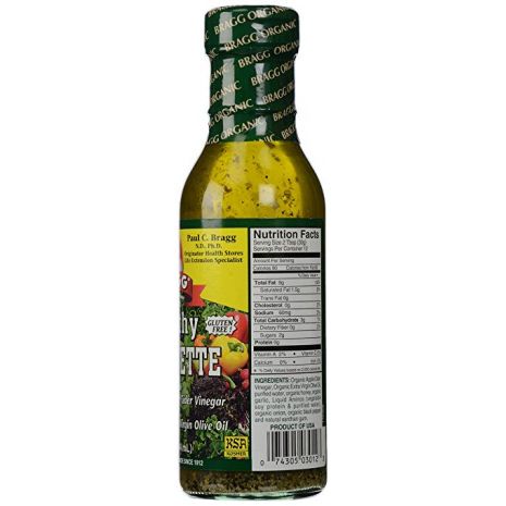This healthy vinaigrette dressing makes a salad special with its tasty, tangy flavor. A zesty blend of our Organic Extra Virgin, First Cold Pressed Olive Oil, combined with our Bragg Organic Apple Cider Vinegar, Liquid Aminos, garlic, raw honey, onion, minced red bell peppers and delicious organic herbs. Our unique taste brings you a healthy alternative with all the best of the Bragg tradition of healthy eating and living.