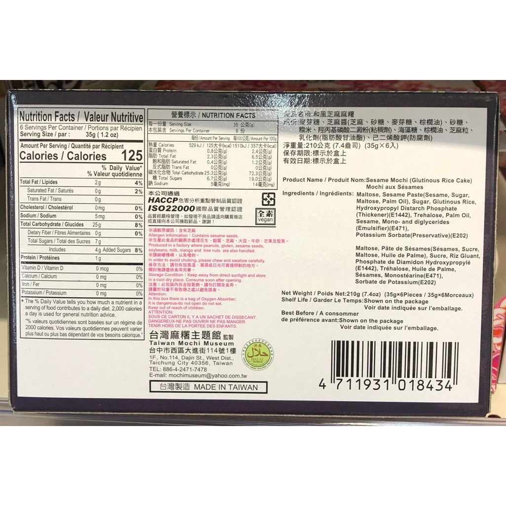 maltose, sugar, glutinous rice, tapioca starch, vegetable oil, sesame paste, sesame flavour, preservative: sorbic acid (E200)).